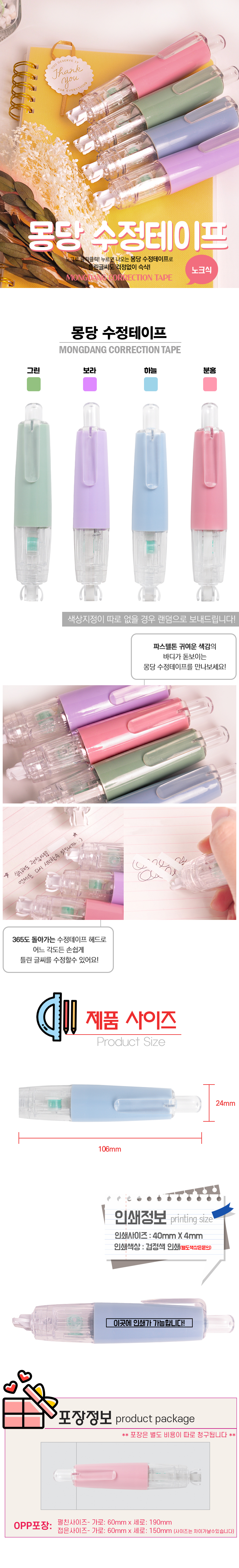 -365도로 돌아가는 수정테이프 헤드- 접착력이 강력한 얇은 필름- 노크를 누르면 간편하게 사용가능한 수정테이프- 다양한 색상의 바디컬러