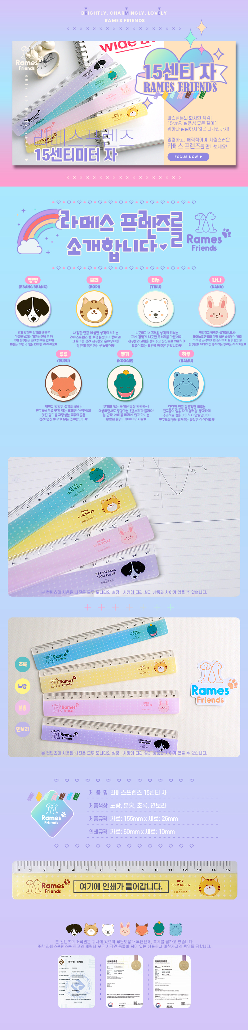 - 귀여운 라메스 프렌즈 캐릭터가 돋보이는디자인-4가지 귀여운 색감의 문구용 15센치 자- 작고 간편해 필통안에 쏙 들어가는 사이즈- 바디에 원하는 문구를 인쇄할 수 있어요