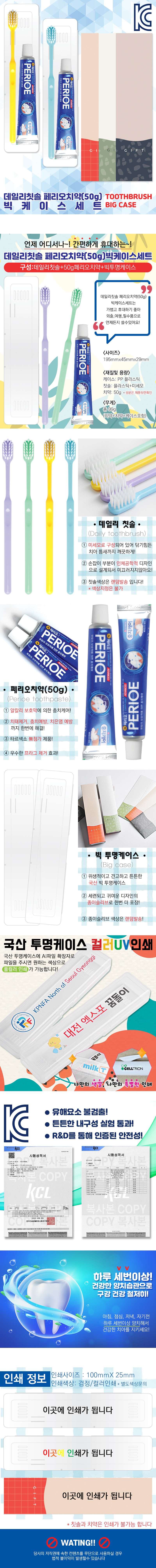 - 여행갈때 필수품 칫솔+치약세트- 견고하고 위생적인 국내산 빅케이스- 케이스에 내가 원하는 색상으로 컬러인쇄 가능- 귀여운 색감의 종이슬리브로 한번 더 포장