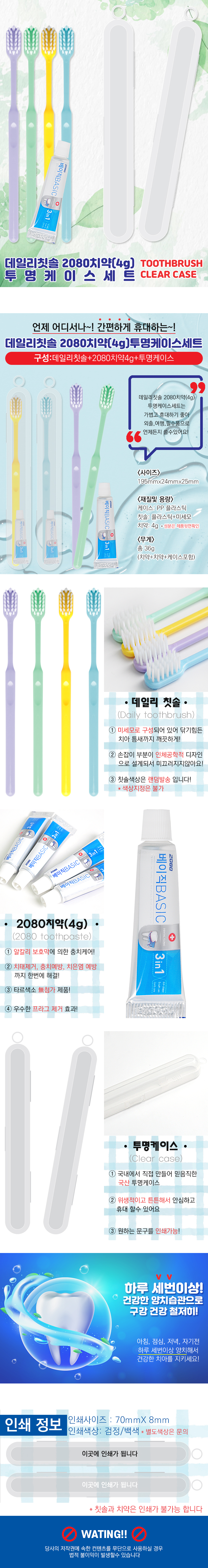 - 여행갈때 필수품 칫솔+치약세트- 견고하고 위생적인 국내산 투명케이스- 케이스에 내가 원하는 문구로 컬러인쇄 가능- 언제 어디서나 간편하게 휴대 가능