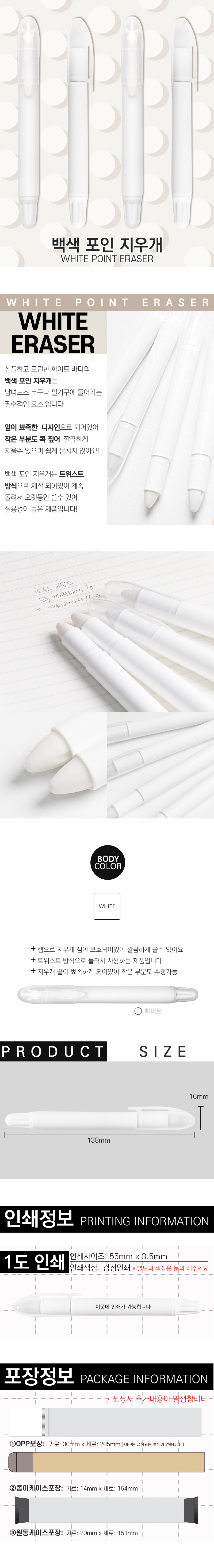 - 화이트 바디색상이 돋보이는제품- 트위스트 방식으로 돌려서 지우개심이 나오는 제품- 끝이 뾰족하게 되어있어 작은 부분도 간편하게 수정가능