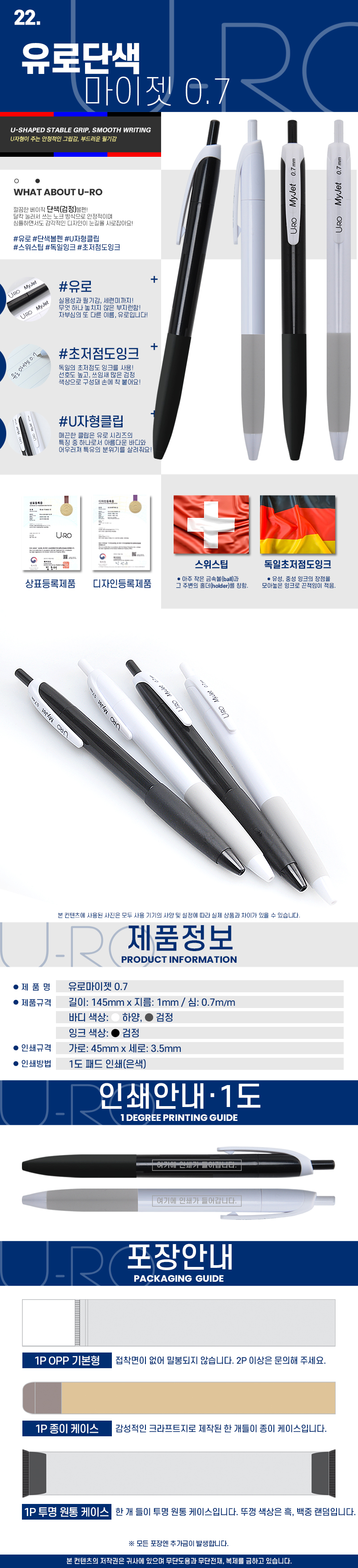 - 대중적이고 부드러운 필기감이 강점인 유로 브랜드- 가볍고 부드러운 필기감- 편안한 그립감과 필기 시 쥐기 편한 바디 두께- 심플하고 깔끔한 색상의 바디컬러